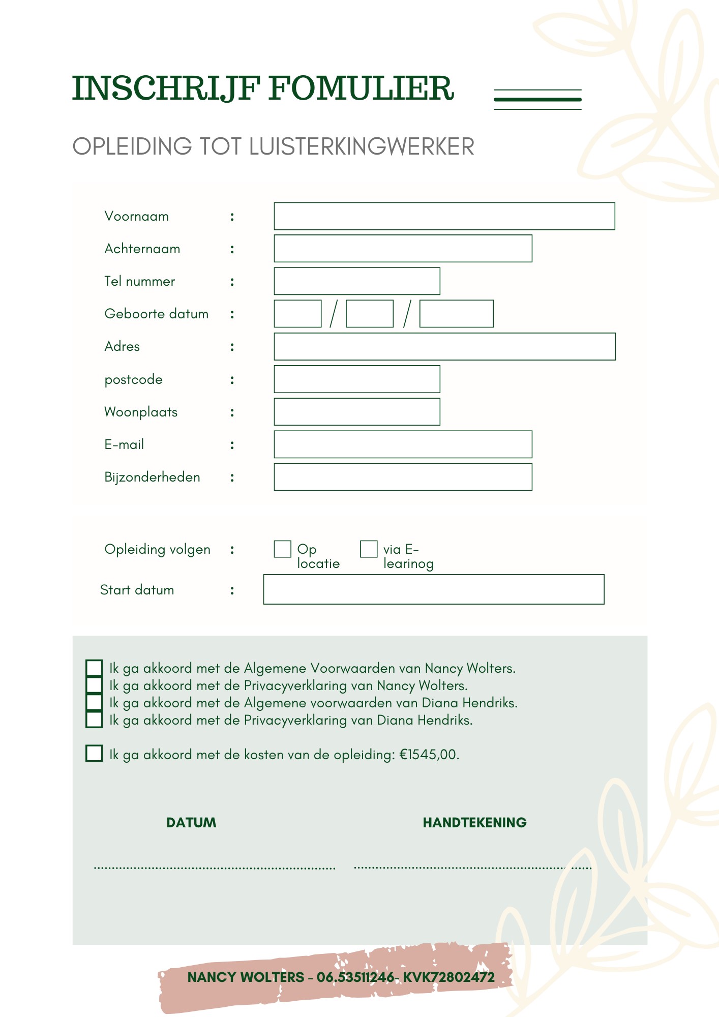 Op de eerste lesdag ontvang je een opleidingsmap met de theorie voor de gehele opleiding. Tijdens de vijf lesdagen leg ik de methodiek uit en oefenen we zoveel mogelijk op elkaar, zodat je het direct in de praktijk kunt toepassen.